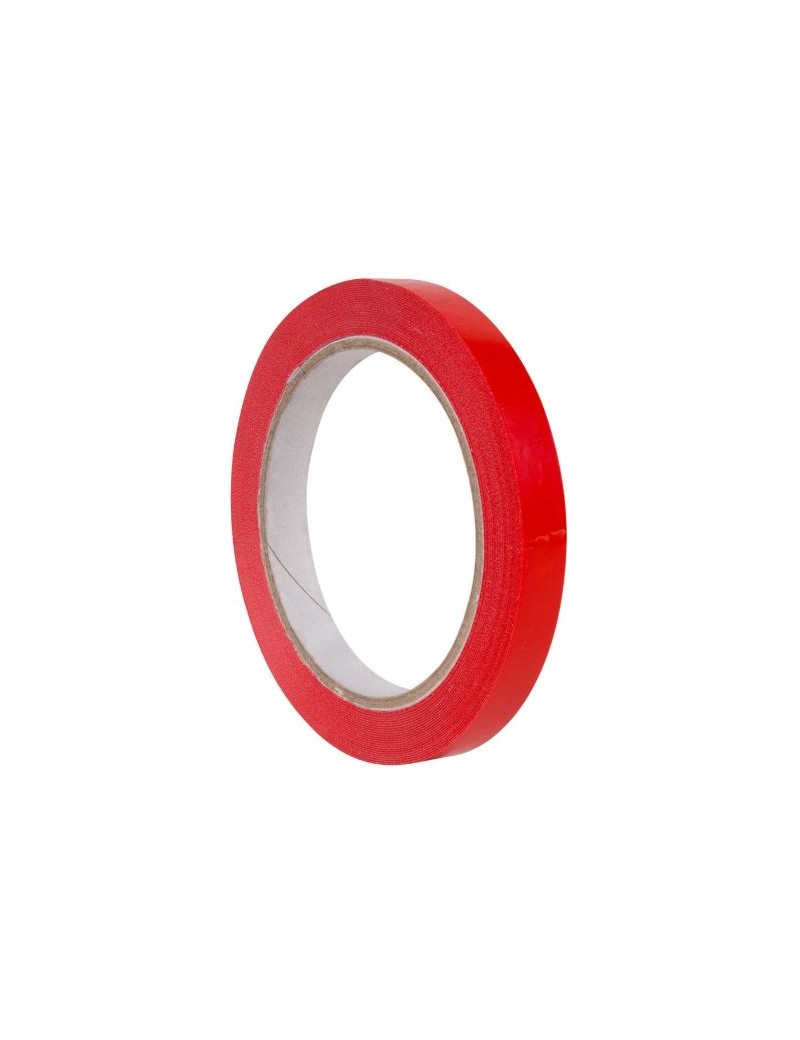 Fita adesiva 12 mm em vermelho, para fechar os sacos plásticos. Rolo com 66 mts.